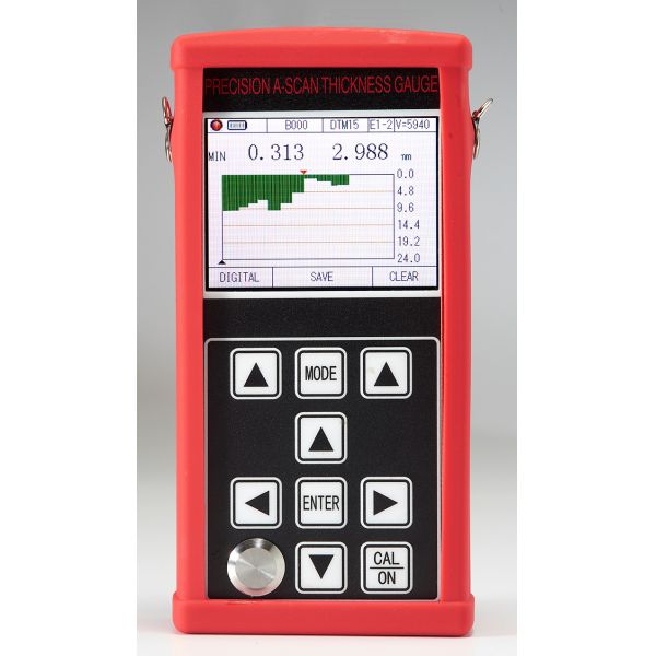 Handheld non-metallic coating thickness gauge with numerical display and A/B scanning function. The principle of pulsed reflection ultrasonic thickness measurement is applicable to the measurement of ultra-thin film material or coating thickness that can make ultrasonic wave propagate in it at a constant speed and can be reflected from its back. The measurement resolution is 0.001mm, the measurement range is as thin as 0.02mm, and the thickness of the coating and the substrate can be measured simultaneously.